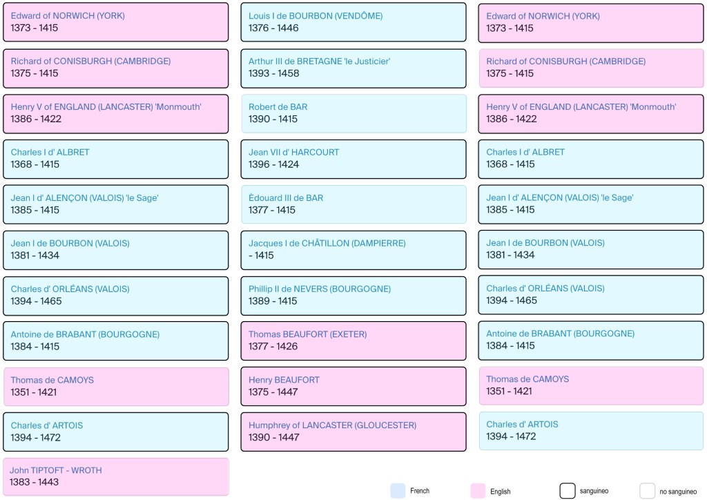 Durante esta batalla Inglaterra tomó gran cantidad de prisioneros franceses, muchos de los cuales eran signeurs de la nobleza. Y si bien varios de ellos fueron trasladados a Londres para pedir rescate, la mayoría fueron ejecutados en Agincourt debido al peligro que resultaba tener tantos guerreros prisioneros y sin contar con los suficientes soldados para controlarlos. En esa cepillada descomunal cayeron algunos de nuestros antepasados. Desconozco si murieron en combate, o infestados de disentería, o atropellados por un caballo desbocado. Pero figuran como fallecidos el 25 de octubre de 1415 en Agincourt. Agrego fallecidos de ambos lados, y también aquellos que participaron de la batalla pero vivieron para contarlo. No son todos ascendientes sanguíneos directos, pero me parece interesante ver tantos vínculos familiares a un simple momento histórico …